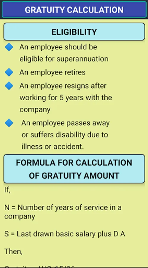 Calculate total gratuity payable to you by Gratuity Calc. Details about gratuity, eligibility, formula and benefits .
