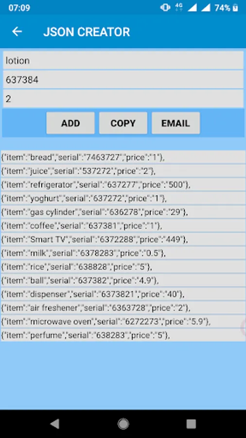 -The app allows you to COPY the json directly or EMAIL it.