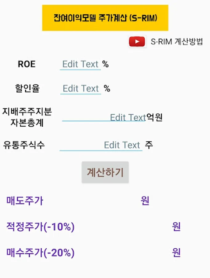 워렌버핏의 DCF, S-RIM, PER, EPS, PBR, BPS 등 재무재표를 활용하여 목표주가 적정주가를 확인해보는 주가계산기 입니다.