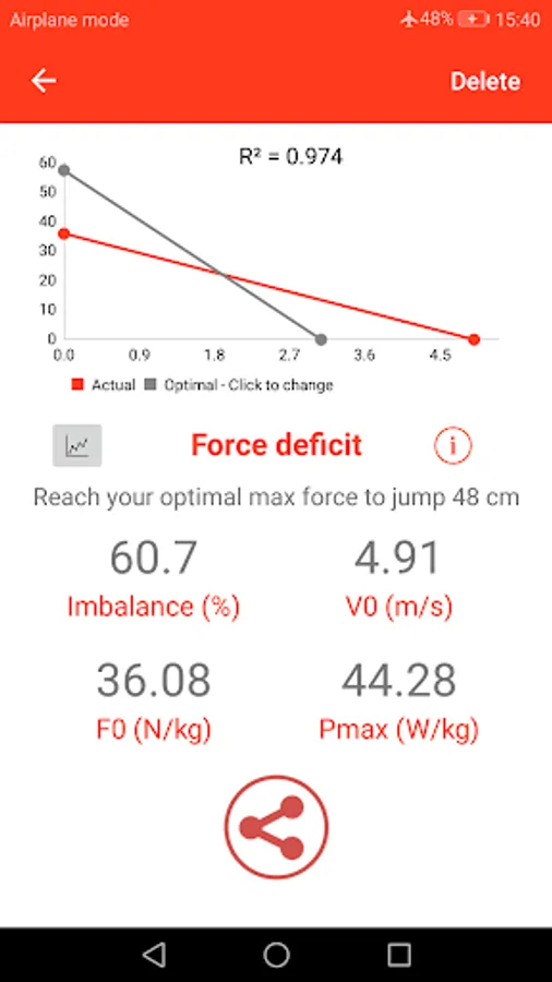 • Calculate the force-velocity profile using the groundbreaking Samozino’s method. You can know your maximal theoretical force, velocity, power and how far you are from your optimal capabilities! You can even get information about which quality (force or velocity) you should work to increase your explosive performance.