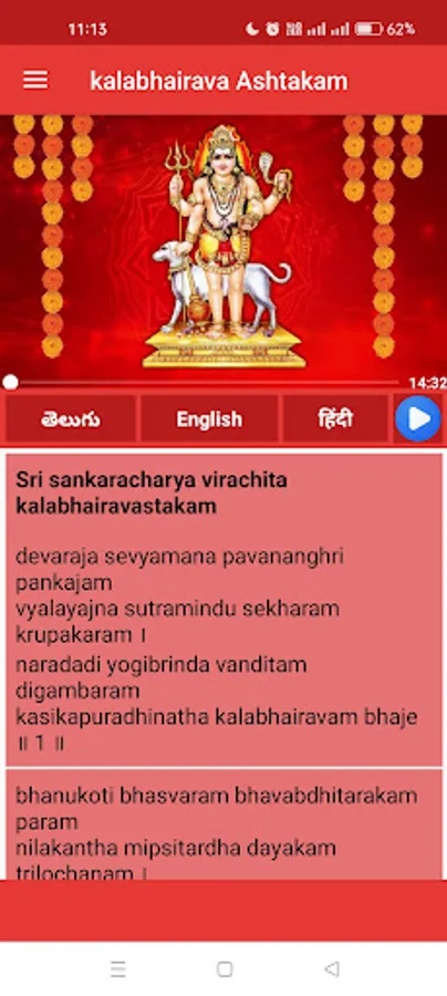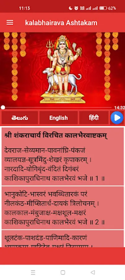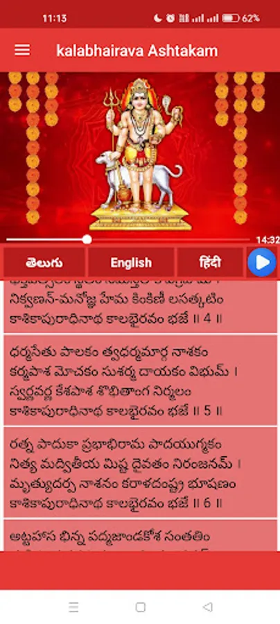 Kalabhairava Ashtakam App contains Kalabhairava Ashtakam song which is played on click and lyrics in Telugu, Hindi and English