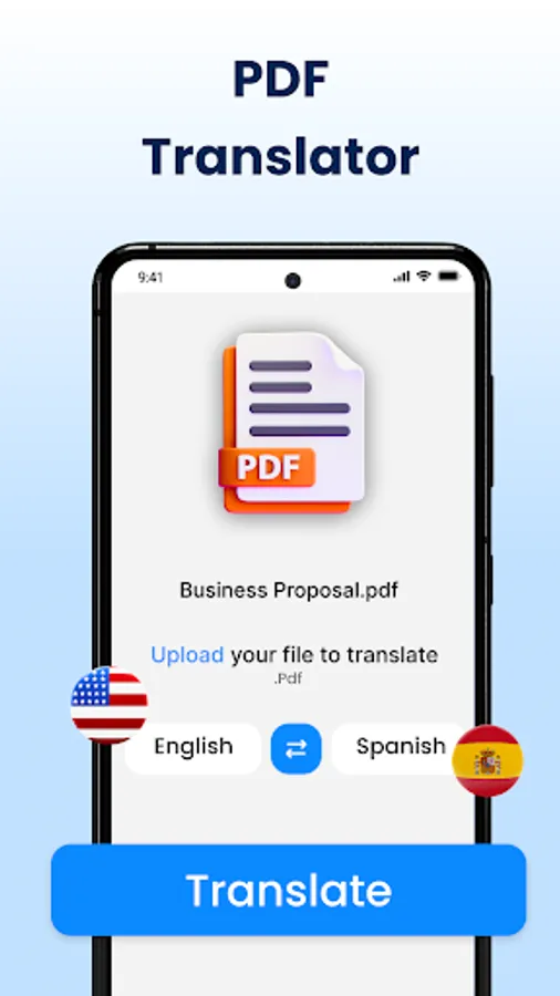 The Talk & Translate languages app provides the feature of a PDF translator. You can import your PDF files from documents and translate them with the language translator app.