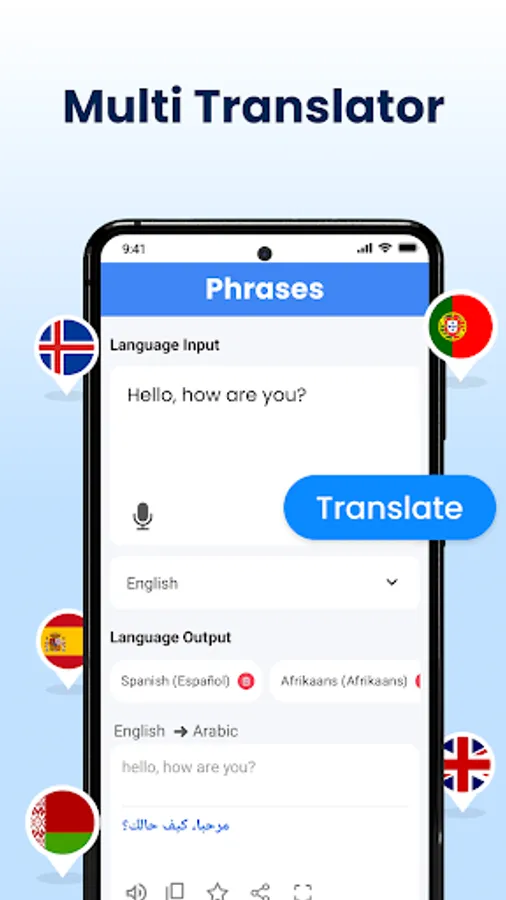 Listen and learn the correct pronunciation of words in different languages. Improve your speaking skills with the language translator app.