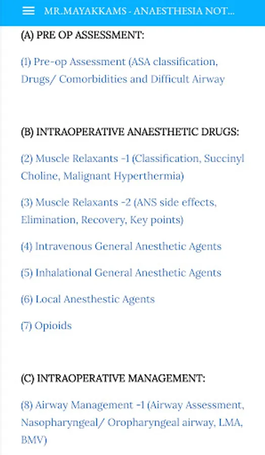 Anaesthesia Notes and Mnemonics app contains useful Mnemonics and Notes for Medical (MBBS) students for their theory and PG entrance exam (NEET PG, INICET PG, USMLE PG) preparations!