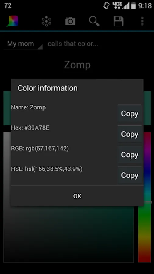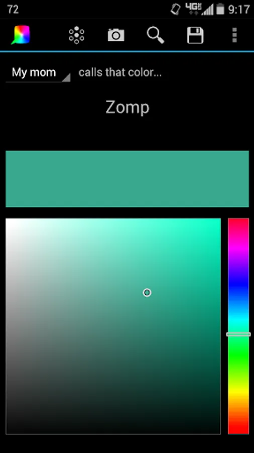 "My Mom Calls That Color..." - Select a color from the built-in color picker or take a picture and find out the "real-world" name for it. View similar colors, save favorites, search by name, or input one yourself (RGB, Hex, and HSL). Click on the color name to find out more information about it!