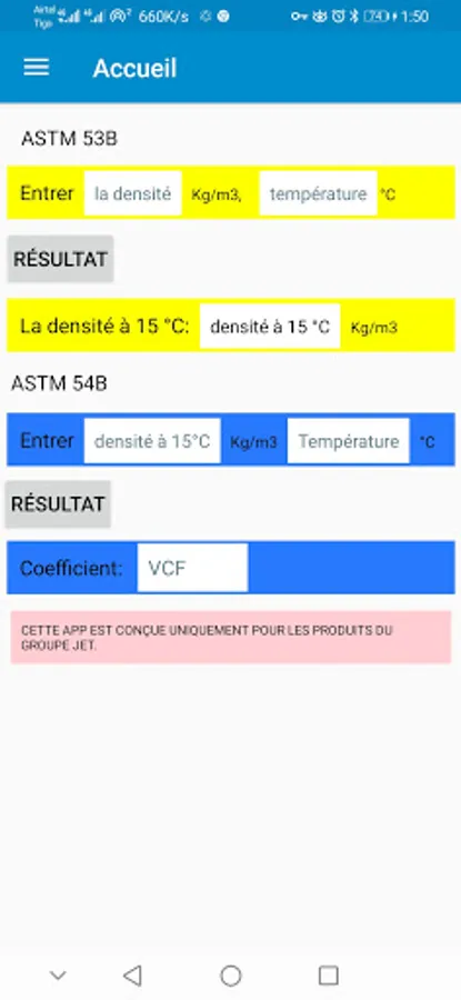 This application allows you to calculate the density at 15 ° C and calculate the volume conversion coefficient (VCF) of the Jet A1.