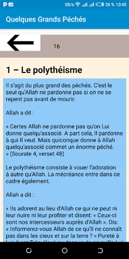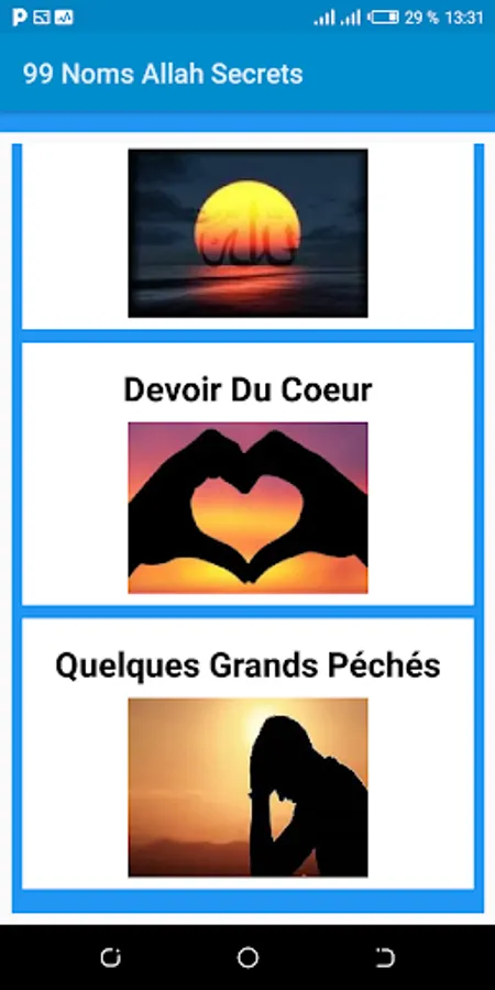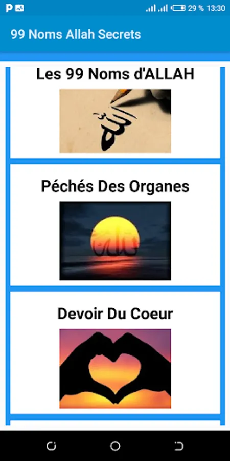 The application will allow you to learn the 99 Names of Allah in voice and their Secret, it is accompanied by the Sins of the Organs, Duty of the Heart and Some Great Sins.