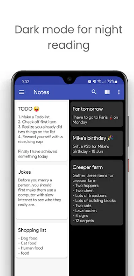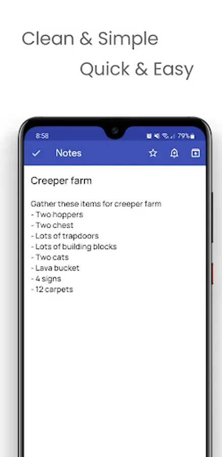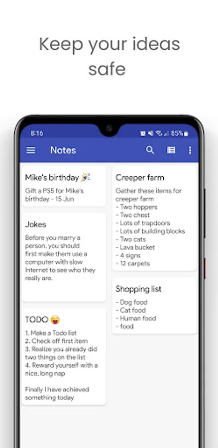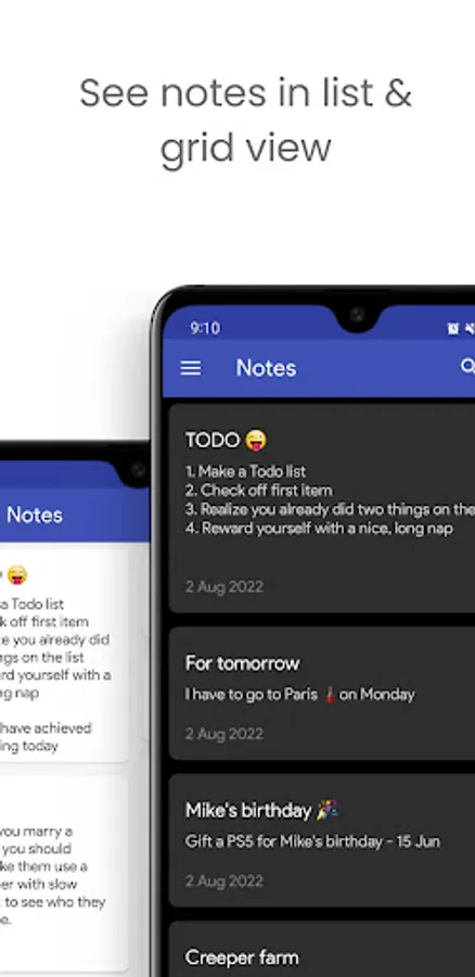 NOTES has a very clean,simple & friendly interface. This app allows you to create infinite notes without any lag and are securely stored on your device storage so they're not shared with anyone else.