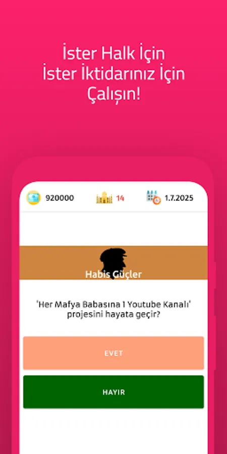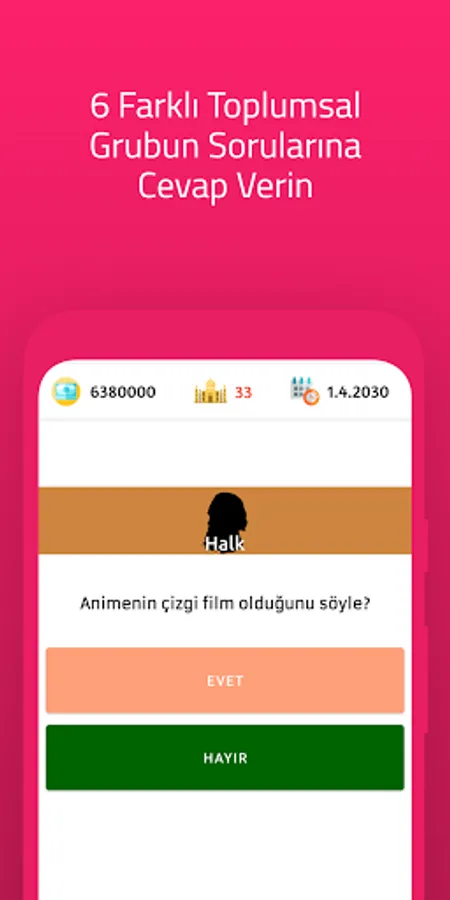 During your rule, your answers to the questions of the 6 social groups that make up your people (Citizens, Army, Opposition, Rich, Community and Malicious Forces) will determine the fate of your country. Do the right thing or resort to illegal means to maintain your power. Enjoy being President!