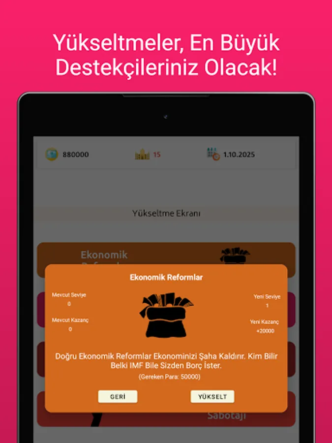Increase your income with economic reforms and taxes using in-game upgrades; Make your people love you by giving them pasta, coal and chess sets, and if the people revolt against you, put your men in the activists and prevent possible riots!