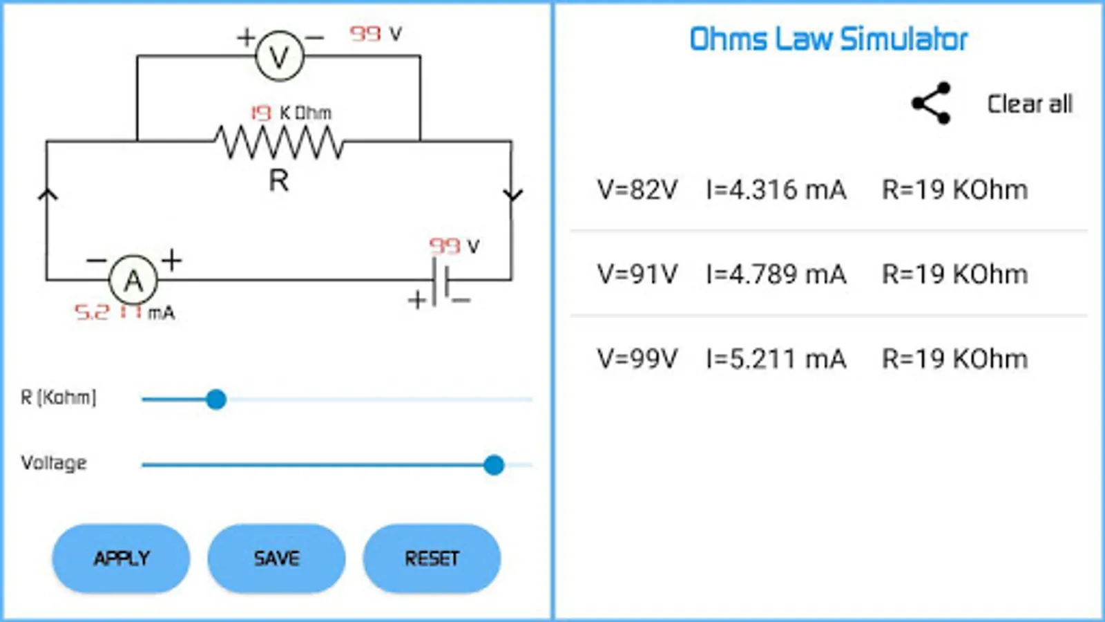 This Simulator is very useful for Electronic researcher for getting fast response Current and Voltage across the Resistor in ohms circuit. This simulator saves your time in Calculation.