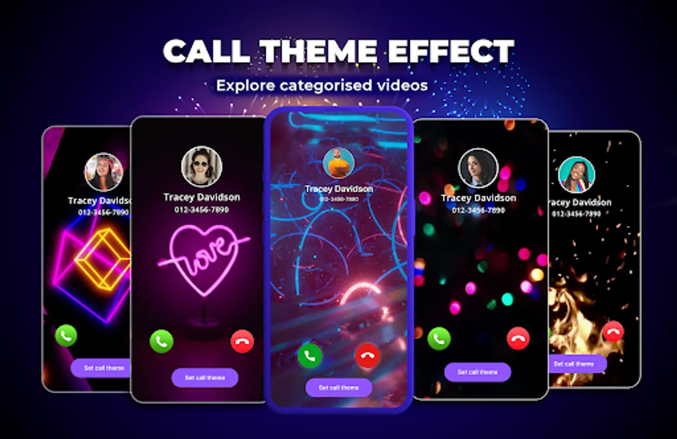 Huge stock of images, themes, effects, animations for you to choose from. Just press the βapplyβ button and you have a beautiful phone call.