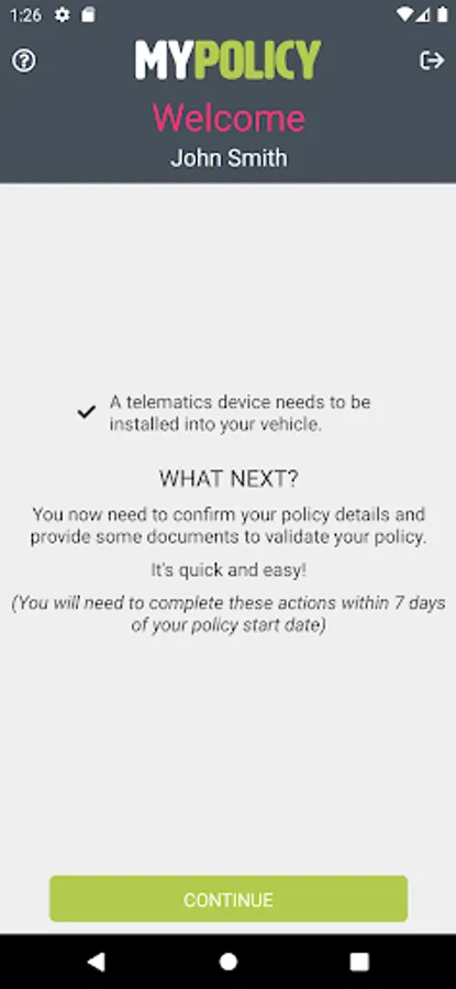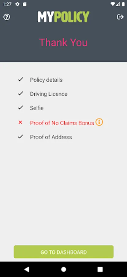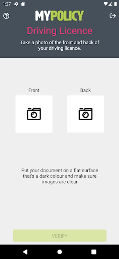 Lightweight application for My Policy customers to verify the details provided when purchasing their motor insurance policy and provide any additional information required. This serves as a one-time validation of your policy, in order to insure with My Policy. After logging into the app, customers are asked to submit photos of various documents, like driving license and proof of no claims bonus, to verify the details declared when taking out the policy. The application has a simple user interface through-out the process and won't take much time.