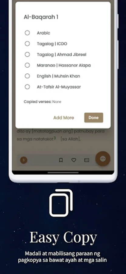 Get ready to enhance your Qur'an study with Quran Tagalog-English! Our app is designed to provide the best user experience while you recite and memorize the Qur'an. With translations available in Tagalog, Maranao and English, this app is perfect for anyone looking to deepen their understanding of the Qur'an. Plus, our app includes a search feature to help you easily find specific verses.