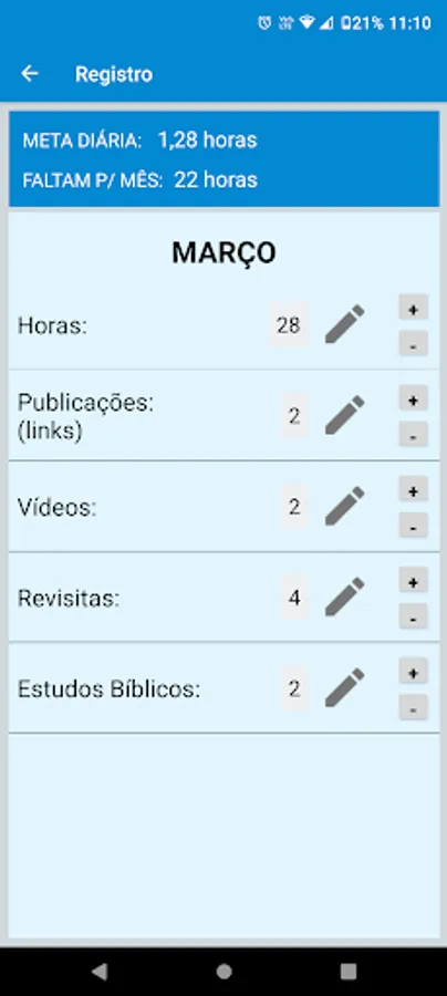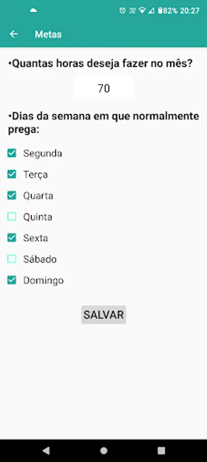 You can set the amount of hours you want to do in the month. You can also select which days of the week you usually preach, the app will then monitor and show you how many hours you have left to reach your goal, as well as the average hours you need to do per day.