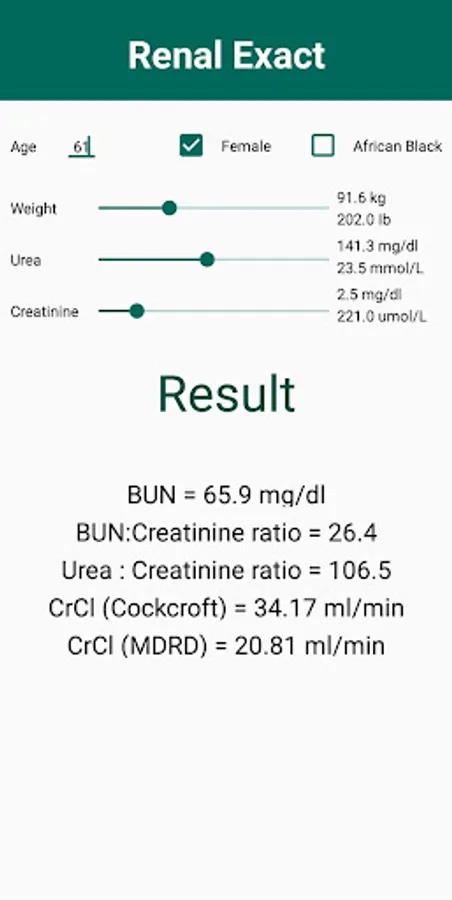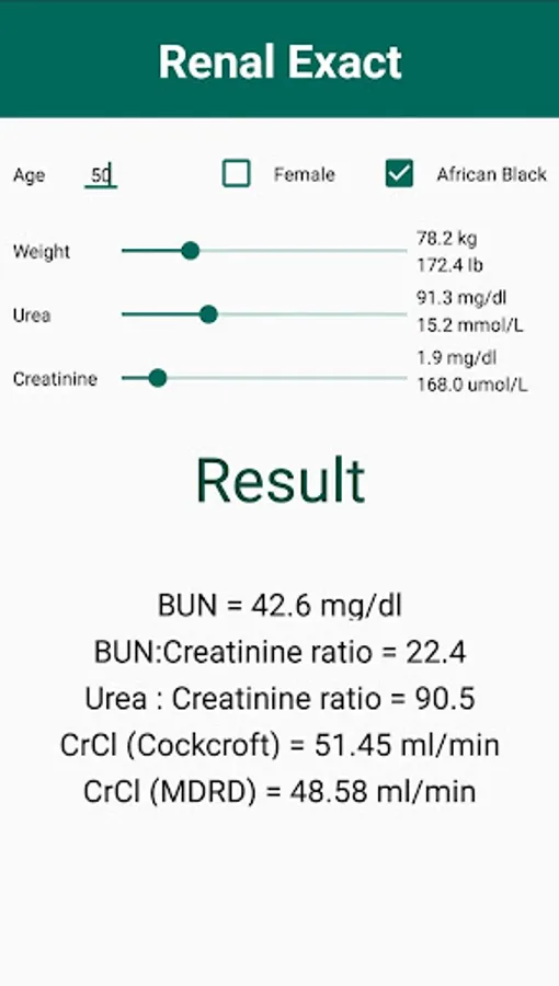 This application will help you to calculate BUN to creatinine ratio and Creatinine Clearance using Cockroft-Gault and MDRD equations