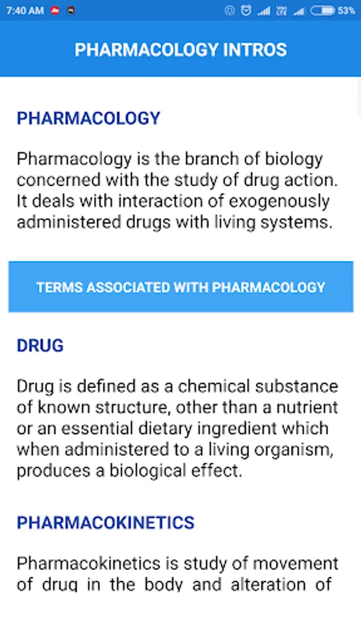This is an app with knowledge of pharmacology, which is useful for B.Pharm(Bachelor of pharmacy), Doctor of Pharmacy, Bachelor of medical science, Nursing and Dental students. It provides basic pharmacology concepts which is very much useful and linked to subjects like clinical pharmacology, toxicology, clinical pharmacy, hospital pharmacy etc. The app gives a short and easy view to study pharmacology.