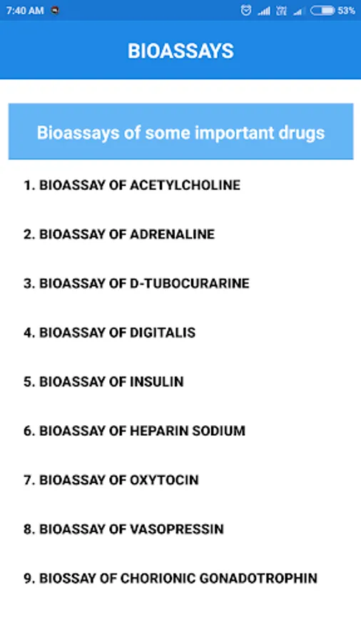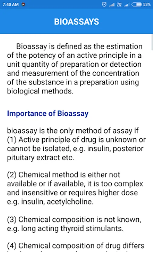 4. Bioassays - It includes the concepts of bioassays, its methods & bioassays of some important drugs like Acetylcholine, Adrenaline, D-Tubocurarine, Digitalis, insulin, Heparin, Oxytocin, Vasopressin, Chorionic Gonadotrophin etc.