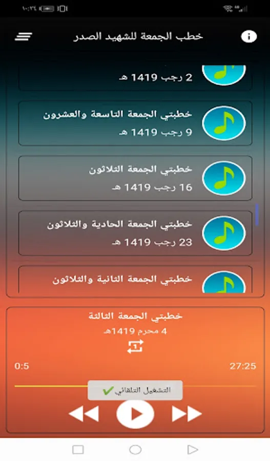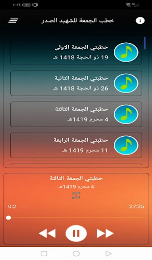 The Friday sermons application of the martyr al-Sadr contains all the Friday sermons delivered by the Great Ayatollah, the martyr Sayyid Muhammad Muhammad Sadiq al-Sadr, may God sanctify his honorable secret and his pure soul in the Great Mosque of Kufa, which are 45 complete sermons in MP3 format.
