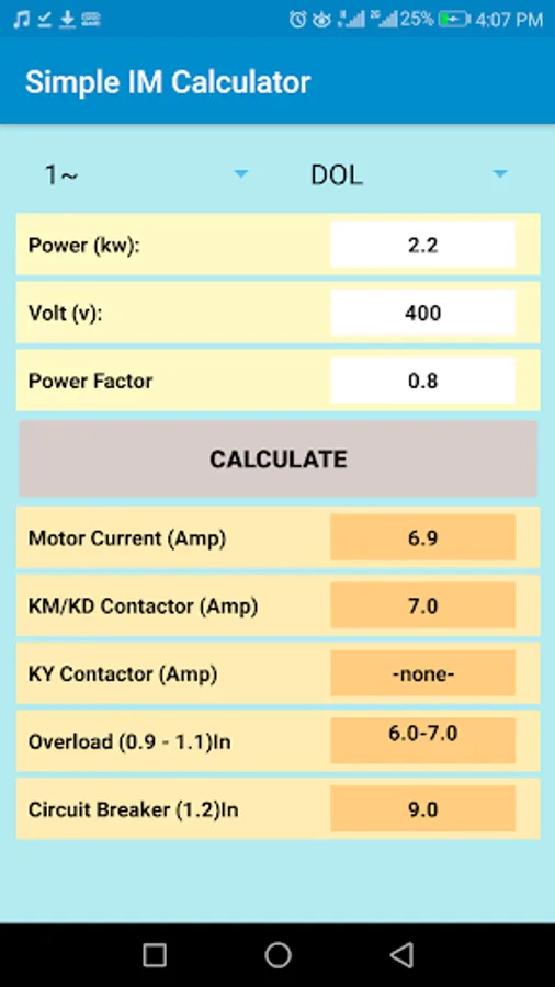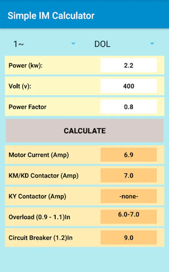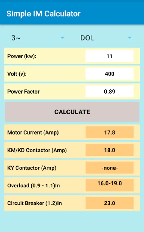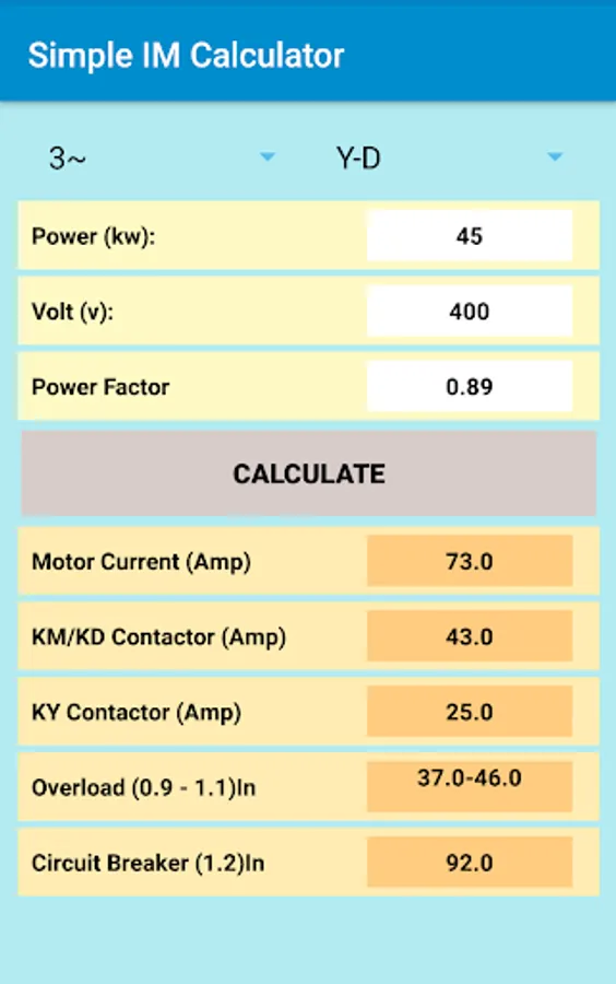 This app help you to calculate value of motor current and capacity of main and star-delta contactors, overload , also circuit breaker