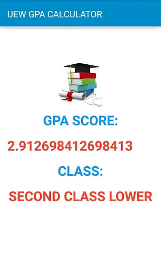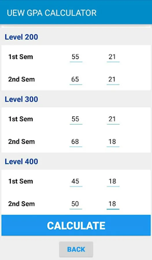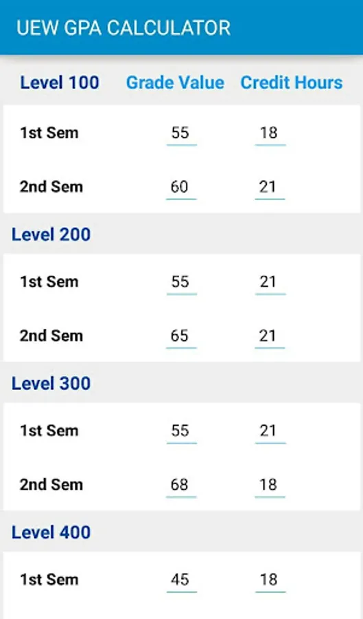 The best and most simplest GPA calculator for all UEW student to calculate the results. It works perfectly and accurately. Use the total grade scores and total credit hours for your calculations.
