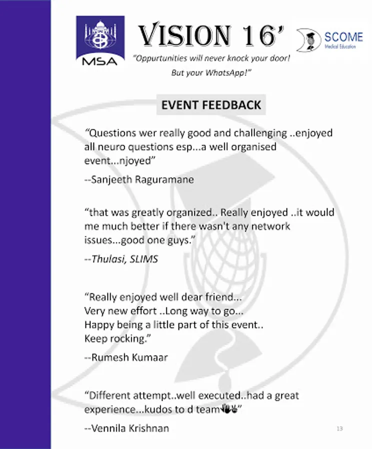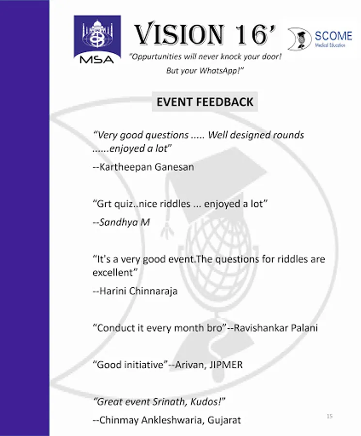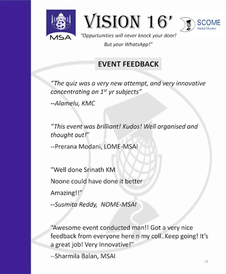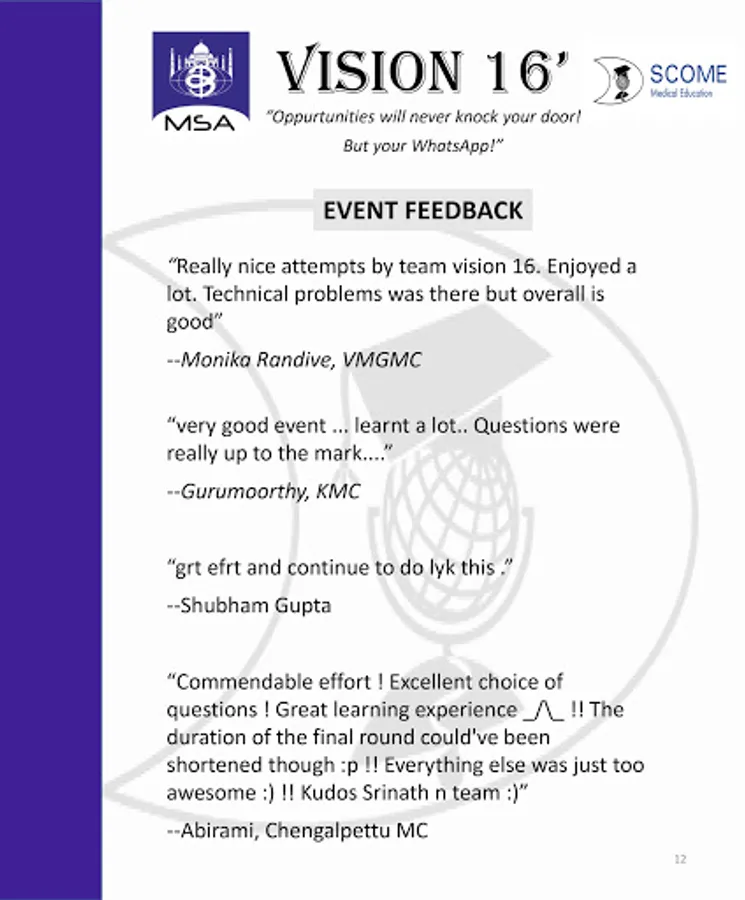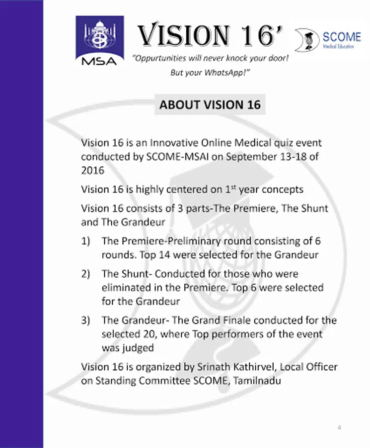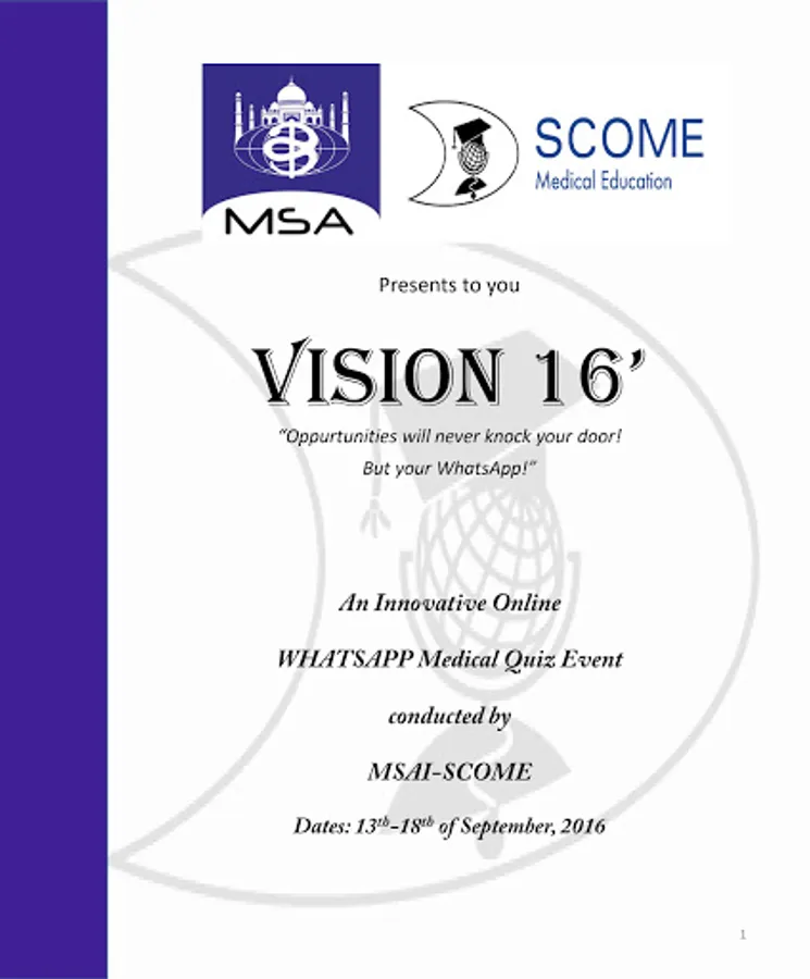 Vision 2016 is a Pan India Online Medical quiz conducted by Dr.Srinath KM, Local officer - SCOME, MSAI (Medical Students Association of India)