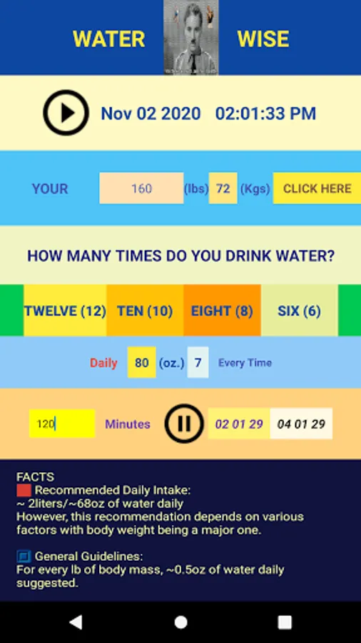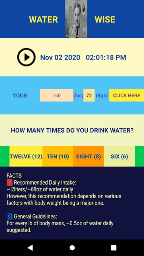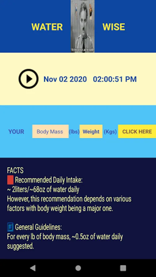 A straightforward and proactive app to remind us to drink water at regular intervals, along with a couple of interesting facts regarding drinking water on a daily basis. The objective of this app is to share info that is simple to use and understand pertaining to health.