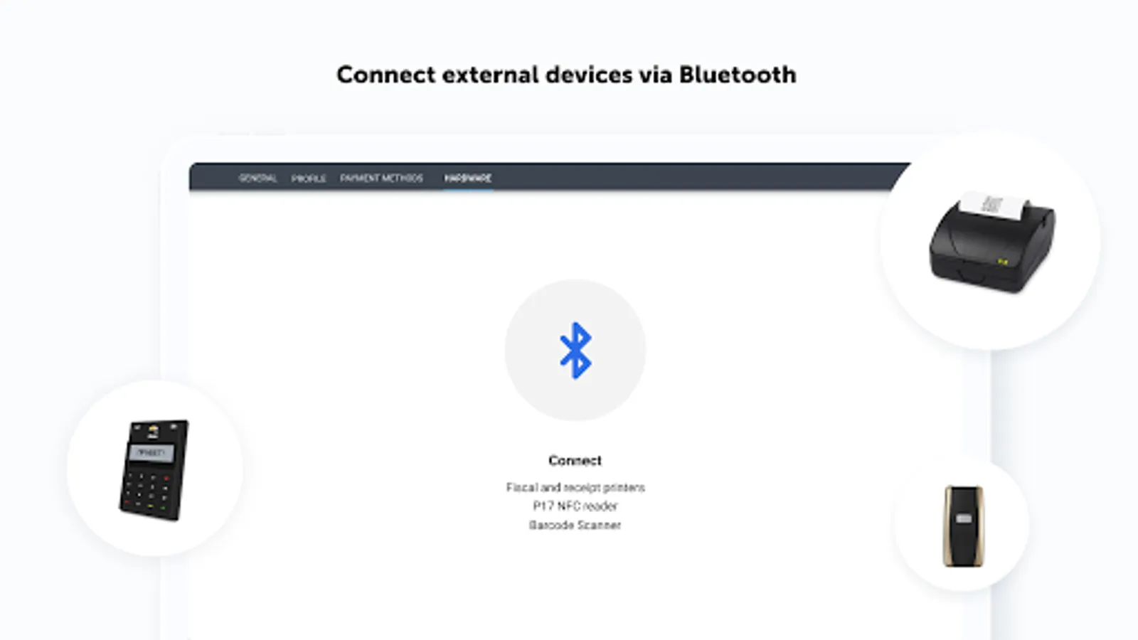 · Account and fiscalize any payment: cash, cards, external electronic receipts