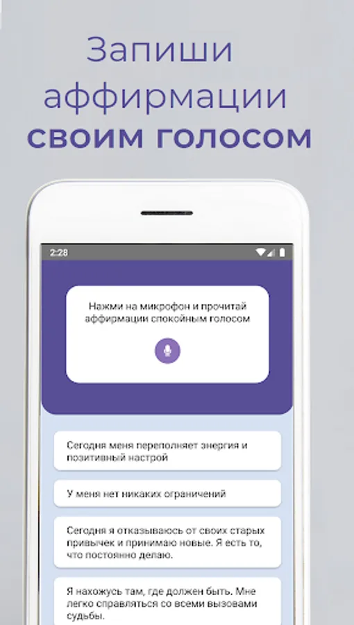 • Large collection of positive affirmations. 10 categories of affirmations: health, motivation, self-confidence, gratitude, finance, career, family, love, anti-stress, sports.