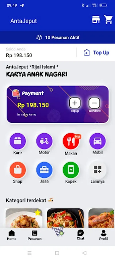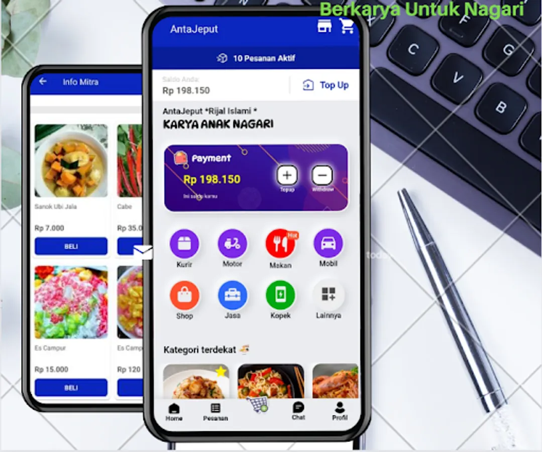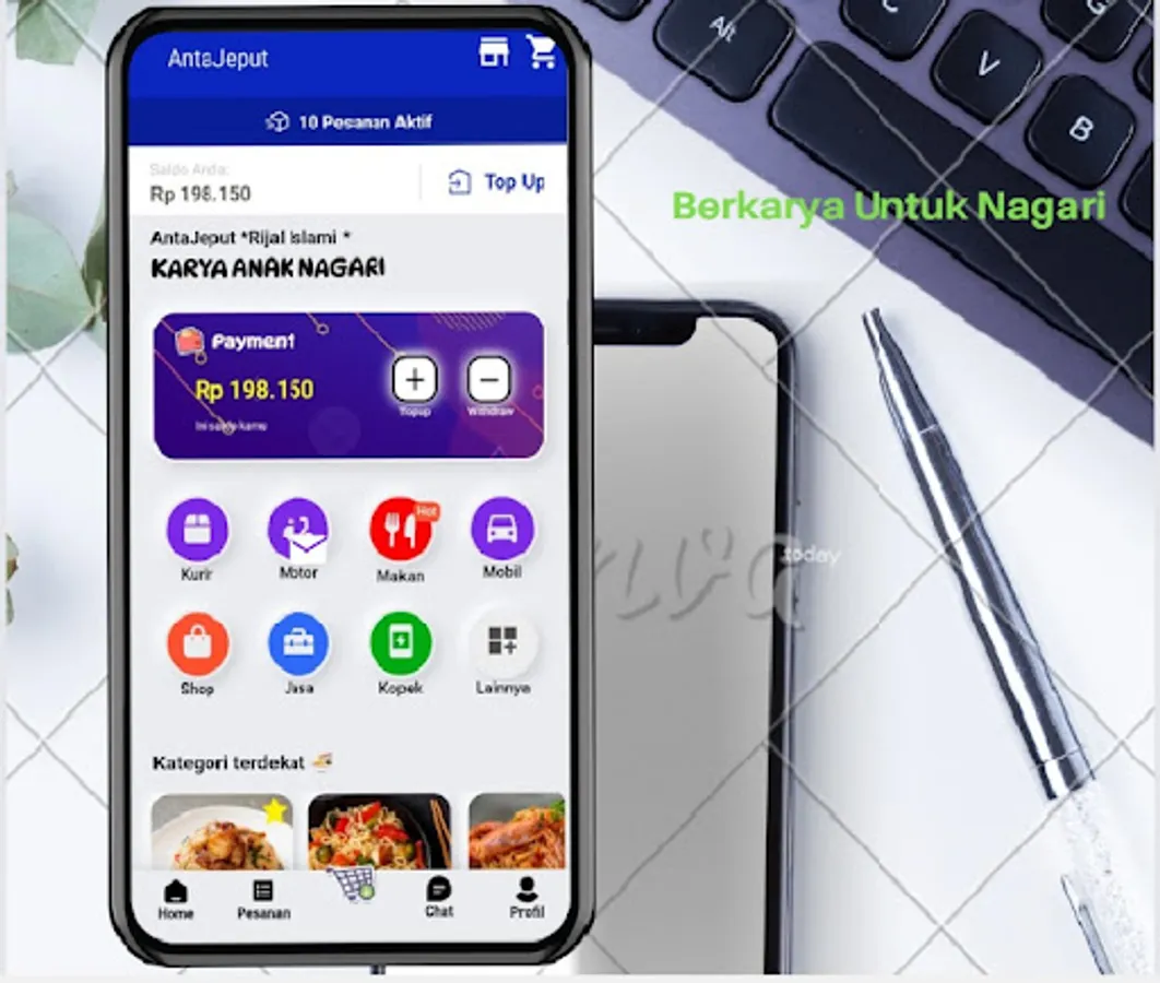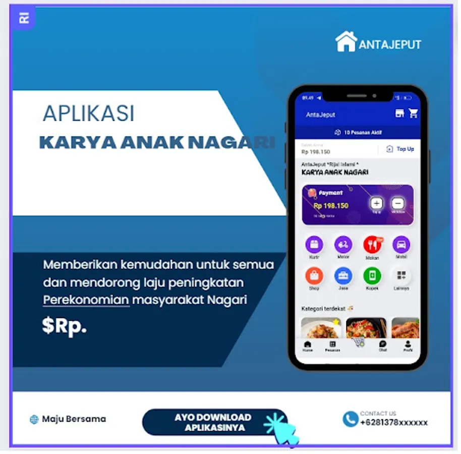 Online motorcycle taxi applications and buying and selling online as well as payments for PLN, credit, transfers, services, etc. With the AntaJeput application, it makes it easy for all of us and encourages economic growth for MSMEs and surrounding communities, the application by Nagari Salareh Aia's children: "Together we can develop wings for the Indonesian nation".