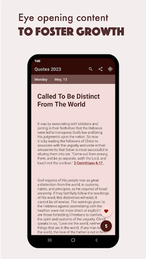 Every day, the app delivers a carefully selected quote from Ellen G. White's writings, covering a wide range of topics such as faith, love, health, education, and personal growth. These quotes have been sourced from her extensive works, including books, articles, and letters, which are regarded as inspired by the Seventh-day Adventist Church.