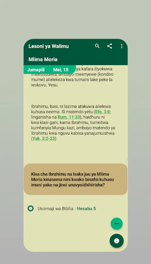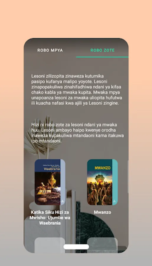 Kua Kiroho ni programu tumishi yenye mpango endelevu wa kuwa kituo chenye hamasa katika kuleta ustawi wa kiroho. Kwa waadventista wasabato pata huduma ya Lesoni kwa mwaka mzima, Robo ya kwanza, robo ya pili, robo ya tatu na hatimaye robo ya nne. Programu ina vipengele vifuatavyo.