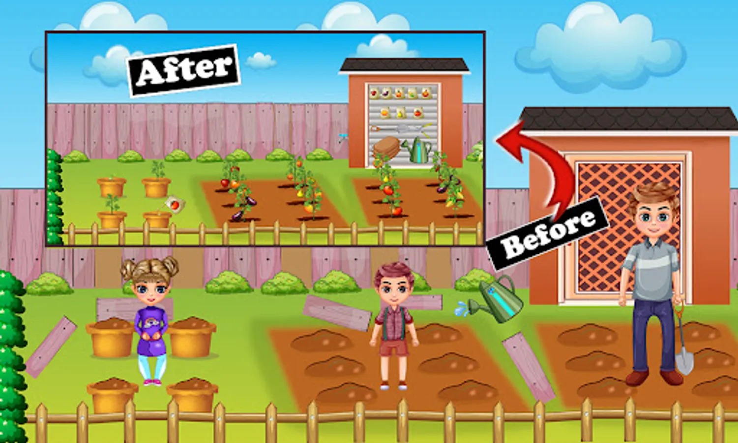 Explore a garden with grandfather and help them to maintain their lawn. Watering plants and harvest all the vegetables and fruits.