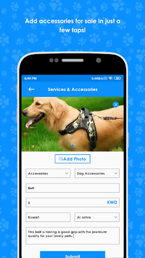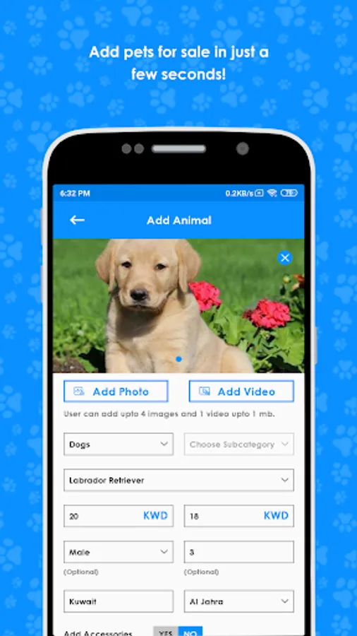 Buy Pet Animals, Sell, Food, Accessories, Delivery, Lost & Found, Grooming, Hotels, Vets, and any requests for your animals.