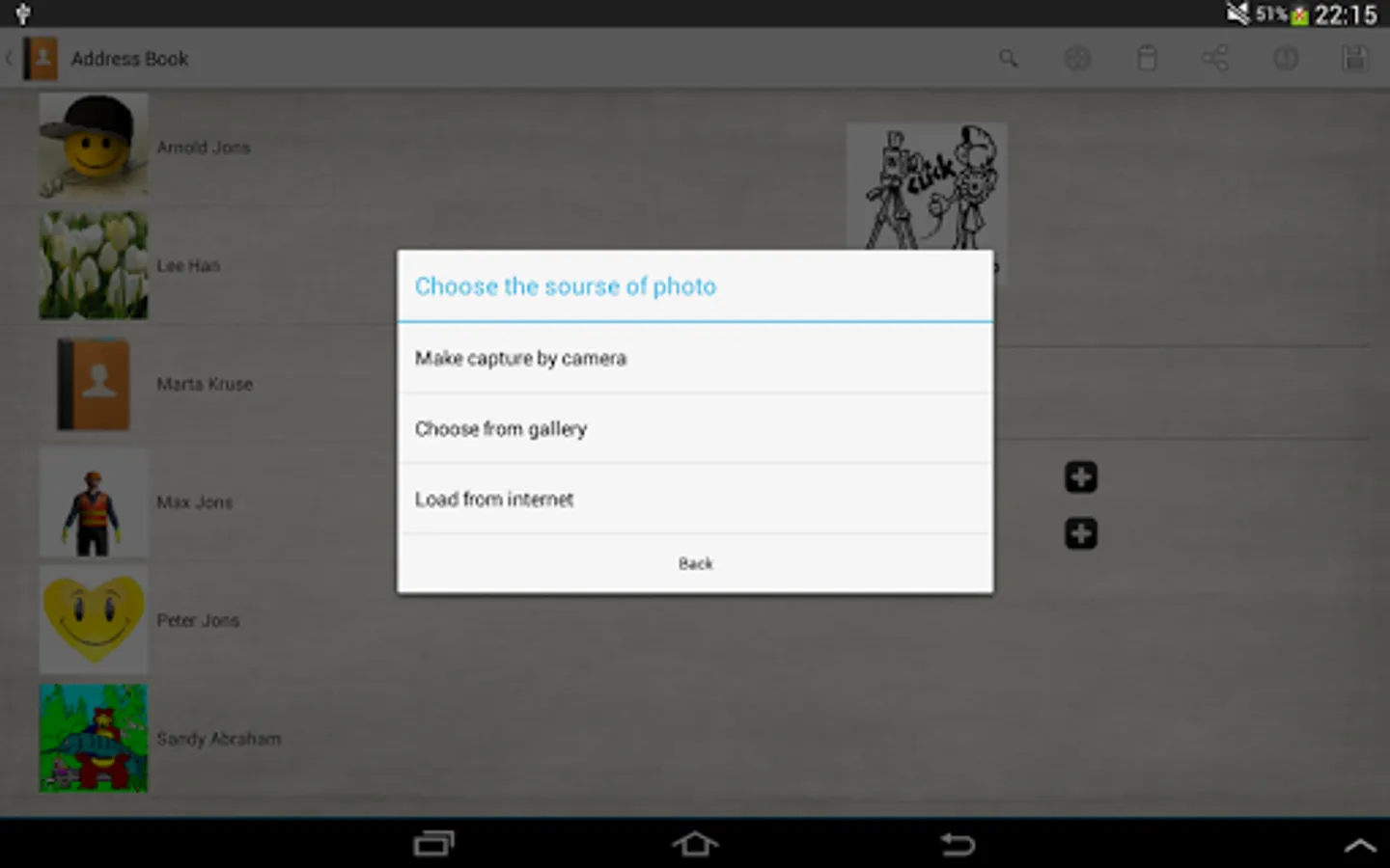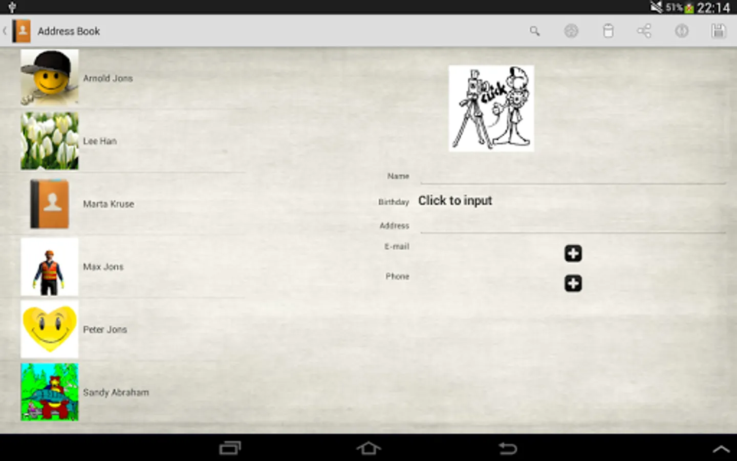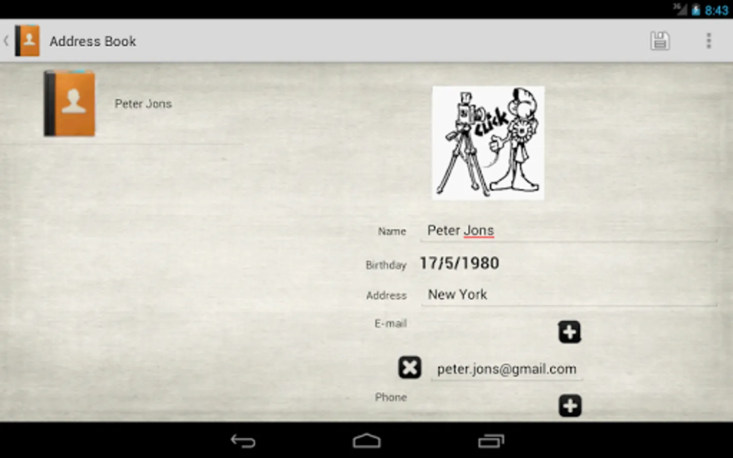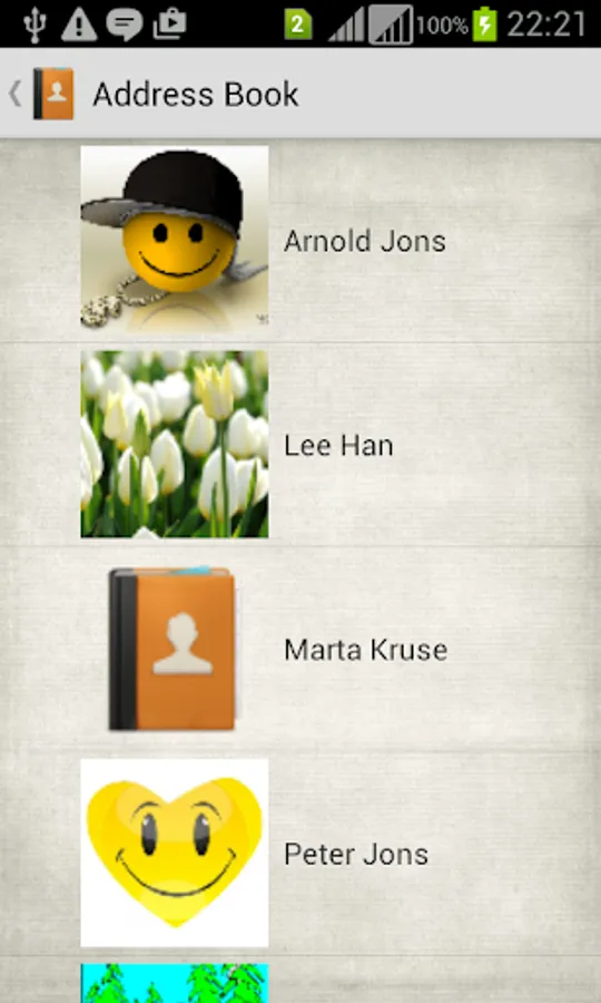 Create, load, edit, save and keep Your Contacts with photos and images in this Book. You may call, send Sms and E-mail.