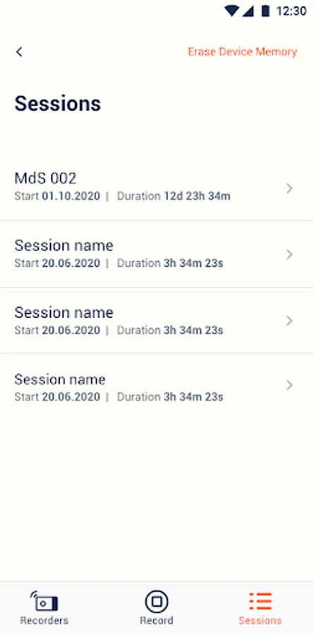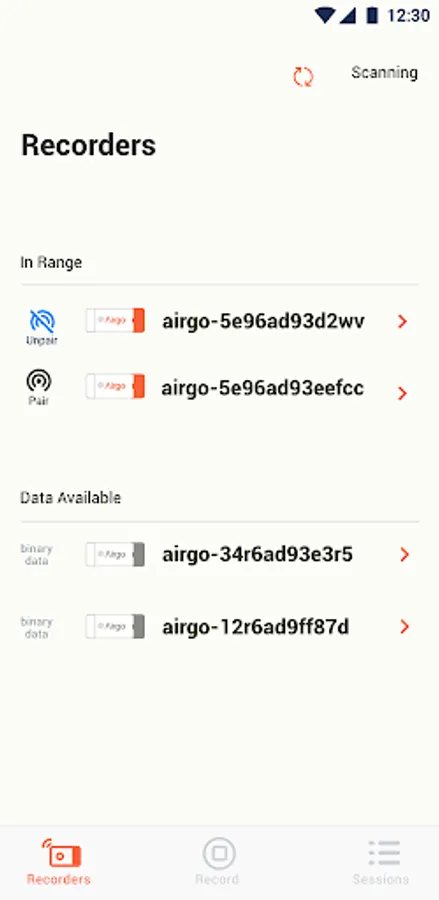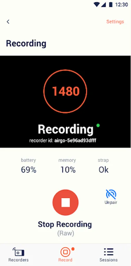 Airgo app communicates via Bluetooth (BLE) with the Airgo recorder to transfer data for live and recorded sessions of users engaged in regular daily activity and full night sleep sessions.