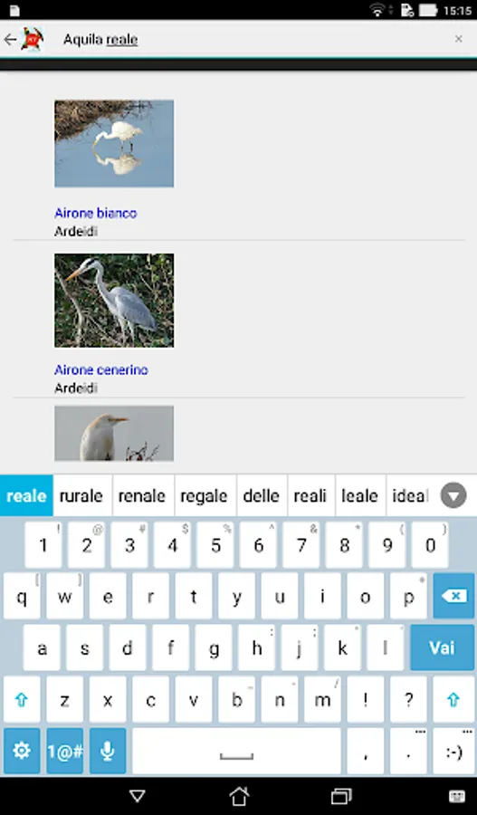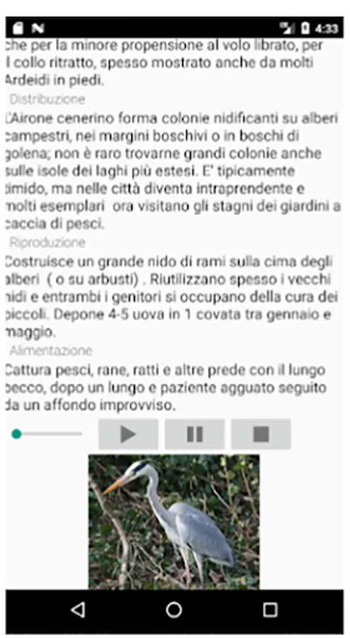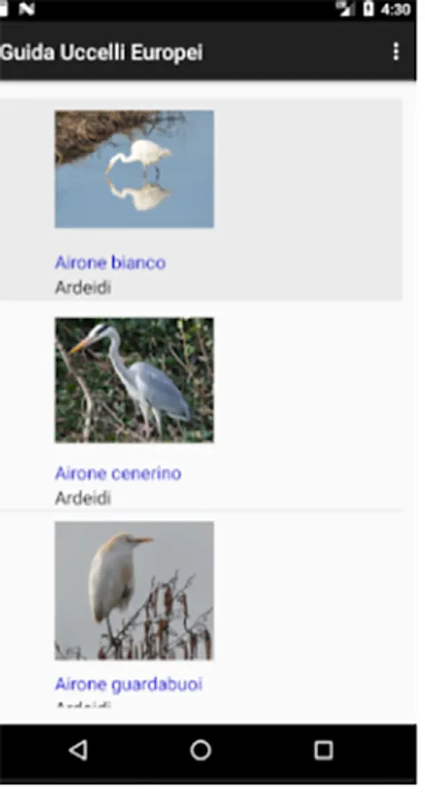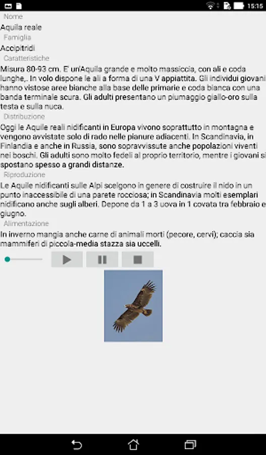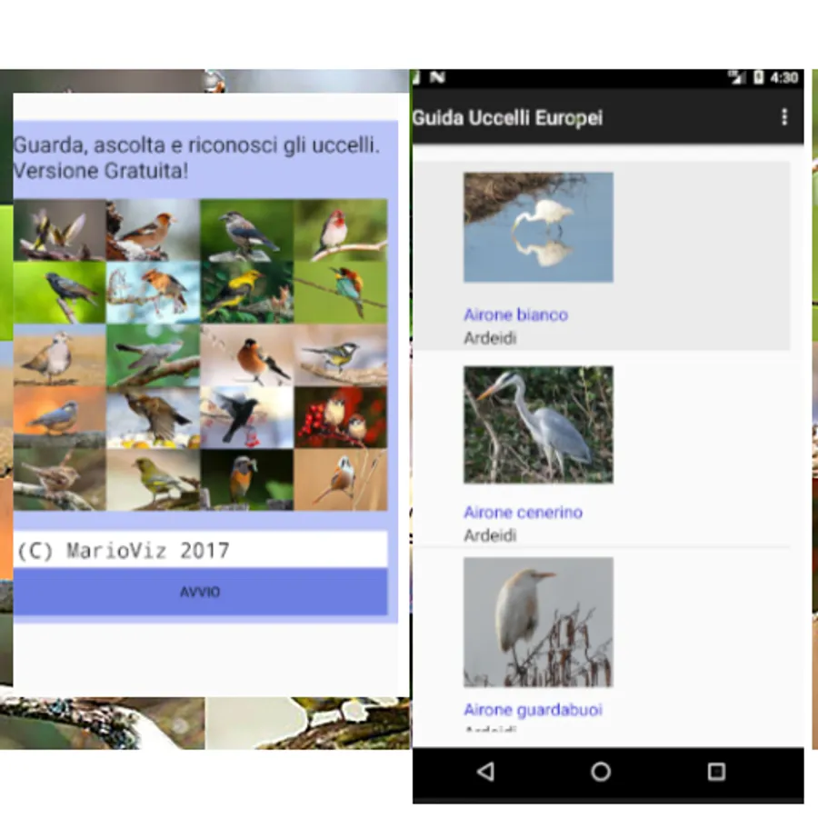 It is a quick guide to recognizing the main birds that live in Italy. Allows you to see a list with photos, name and family of each bird entered. The list can be displayed by name, by family, or you can search for a single name. This gives access to the complete file of a bird which describes the characteristics, distribution, reproduction and feeding. It is also possible to hear the song by touching the play, stop or stop buttons, and you can see the larger picture by touching the image on the card. In the free version you can see the complete cards only of the birds inserted whose name begins with the letter "A", all the others can only be seen in the list. To have the complete cards of all the birds included, it is necessary to buy the complete version for € 4. In this update 90 bird cards have been included.
