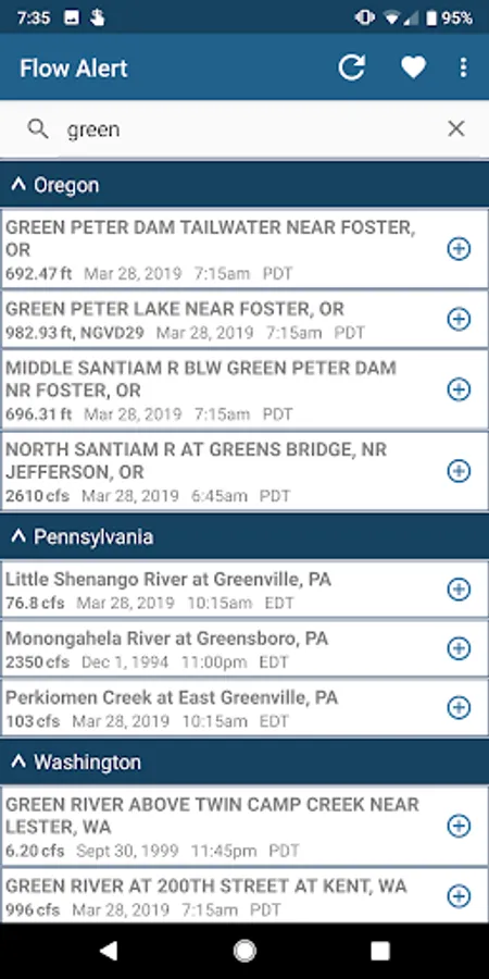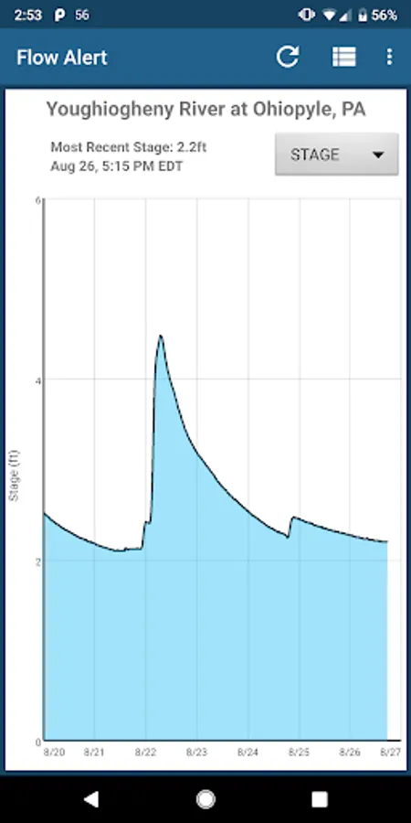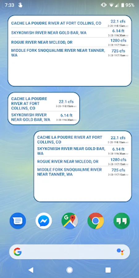 Add a widget on your homescreen that shows flow or stage for your favorite gages. Currently, widgets update automatically every 15 minutes.