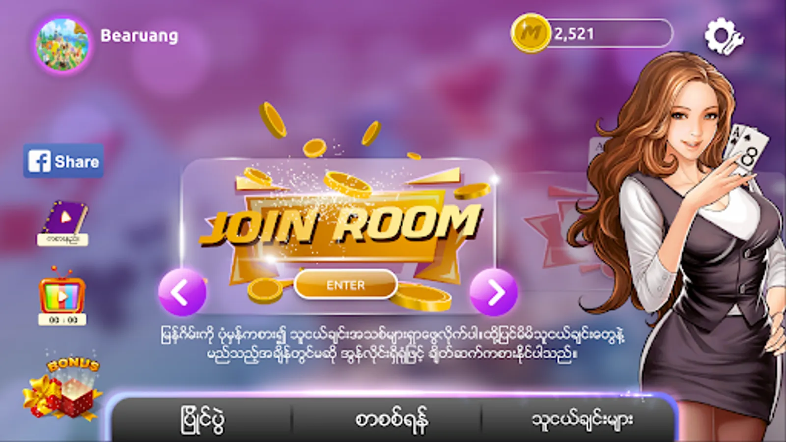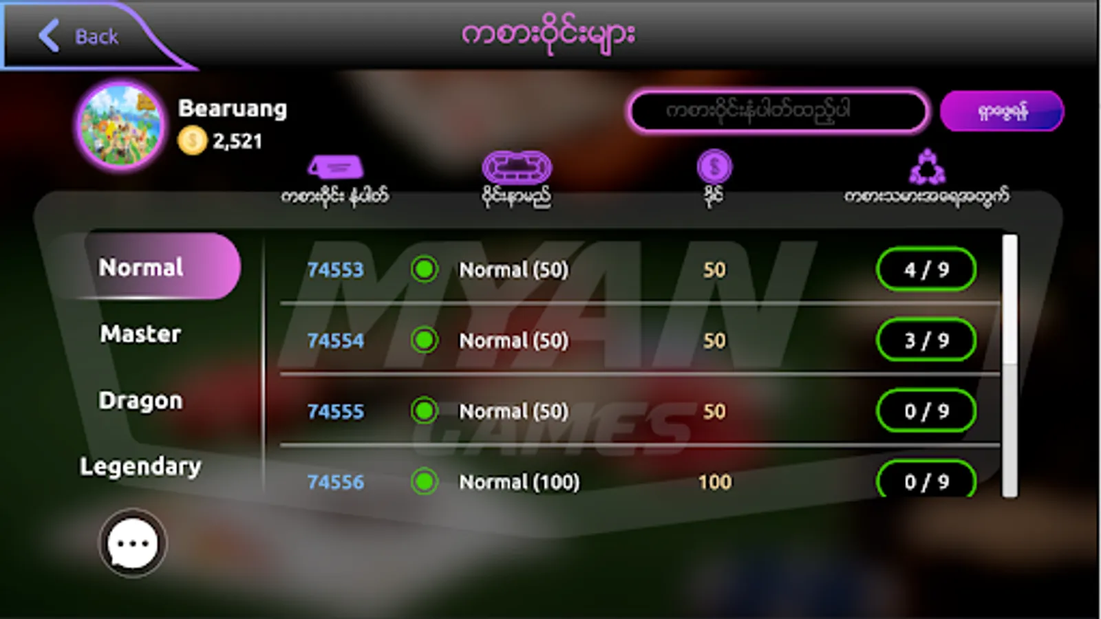 Myangames is a Myanmar traditional poker game application that will be available for both Android and iOS systems. Myangames offers better UI, UX, functions and features that make this game more entertaining. Players can make community through the clan system.