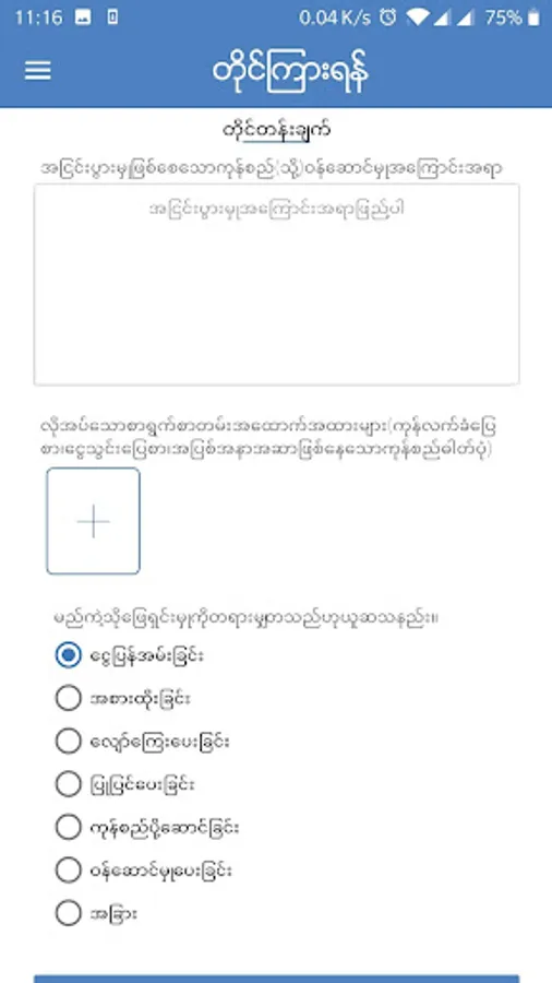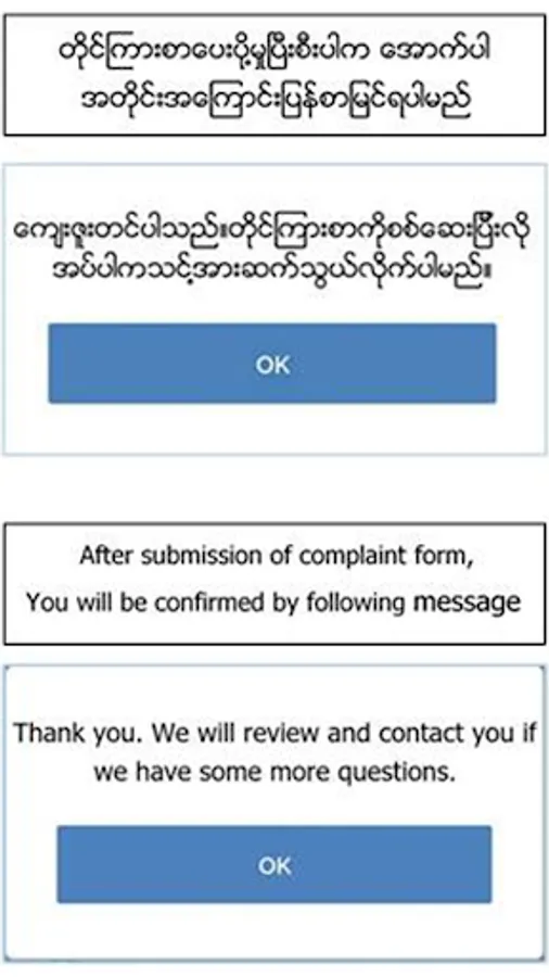 If you have a consumer-related problem such as cheating, damaged product, and nonconformity with warranty/maintenance service, etc., you may submit your consumer complaint from mobile app. (Myanmar Consumers Union App.). The application is available in Myanmar and English.