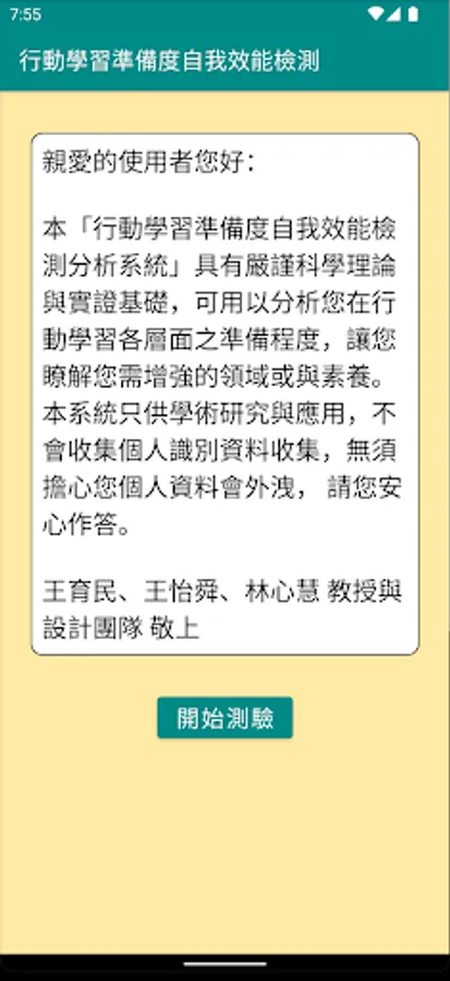 This "Action Learning Readiness Self-Efficacy Testing and Analysis System" has a rigorous scientific theory and empirical basis, which can be used to analyze your readiness in all aspects of action learning, so that you can understand the areas or qualities you need to enhance. This system is only for academic research and application, and will not collect personally identifiable information. There is no need to worry about your personal information being leaked. Please feel free to answer.