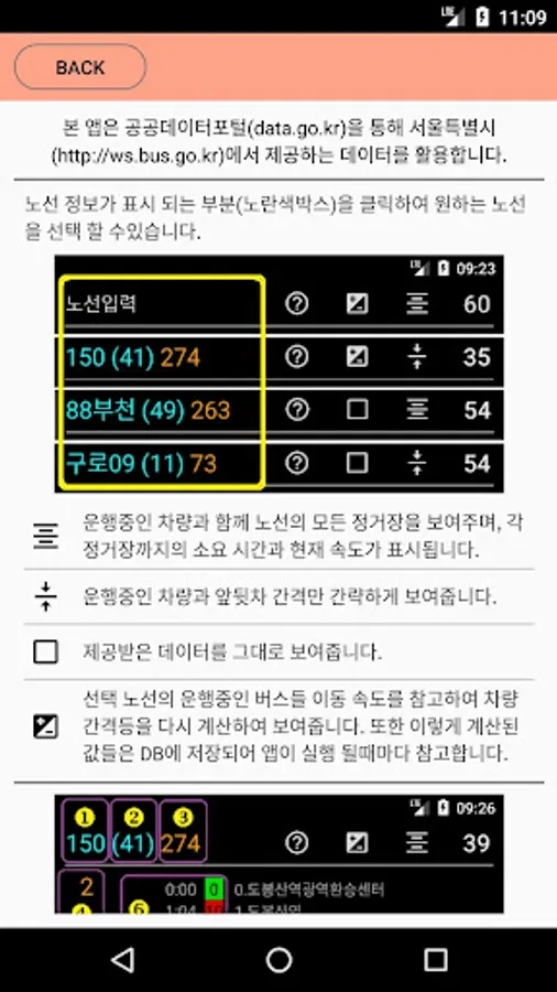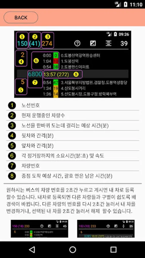 본 앱은 기사용 버스 노선으로, 이미 검색했던 노선으로 쉽게 이동이 가능하며, 운행시 참고할만한 내 노선의 모든 차량간 간격(분) 및 현재 위치, 종점 도착 예상시간, 종점 도착까지의 남은 시간(분) 등을 쉽게 확인할수 있습니다. 또한 각 정류소간 소요 시간과 속도 등도 함께 볼수 있어 차량간 간격을 유지하는데 도움이 되도록 만들어진 앱입니다.