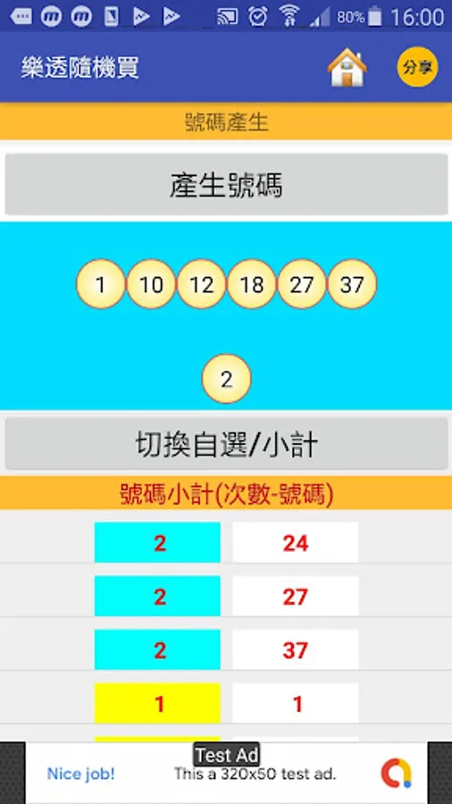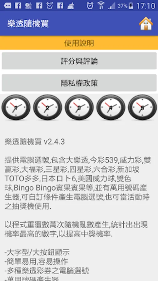 Providing computer selection, including Big Lotto, Lotto 539, Super Lotto, Double Win, Big Forte, 3 Stars, 4 Stars, Mark Six, Singapore TOTO, Singapore 4D, Japan Loto 6, USA Power Ball, Two Color Ball , Bingo Bingo, etc., and a universal number generator, can be customized to create a computer selection number, or can be used as a lottery machine when activity.