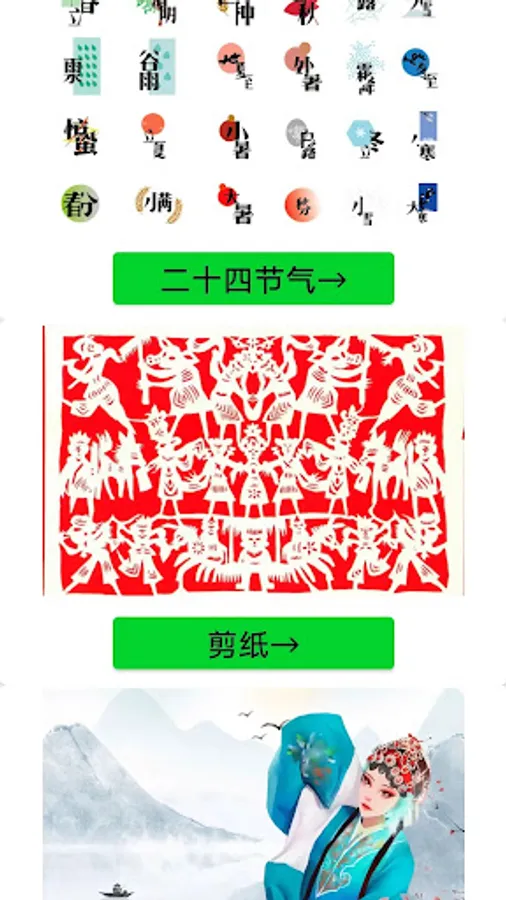 Users can learn about relevant Chinese traditional culture and learn there. Including twenty-four solar terms, paper cutting, drama, traditional food, etc.