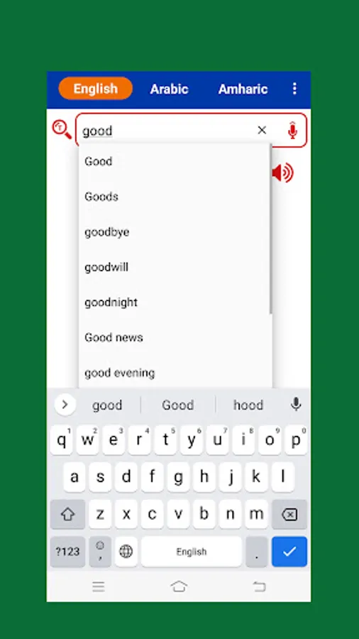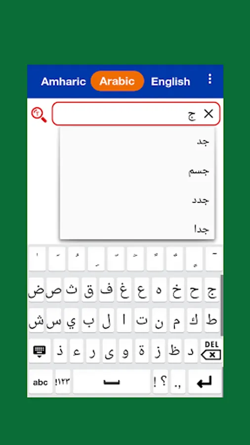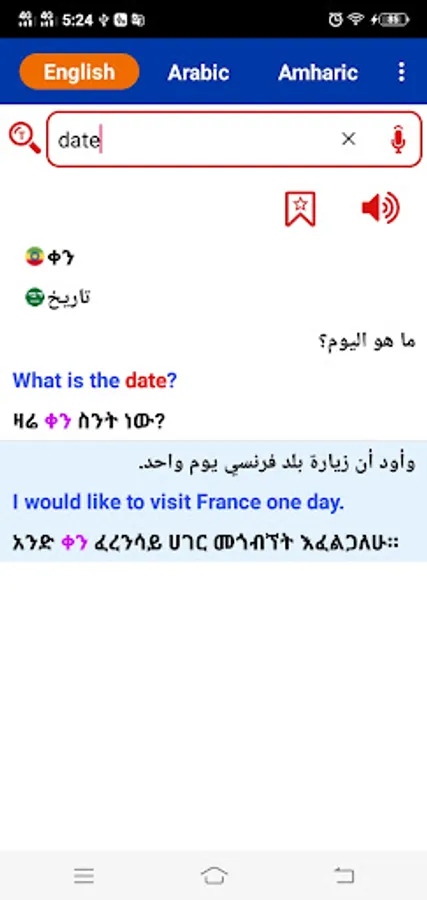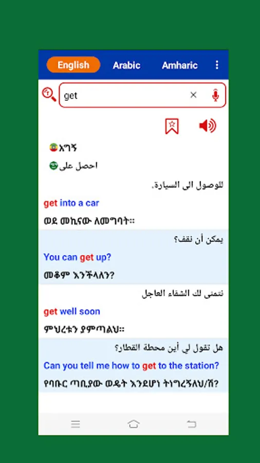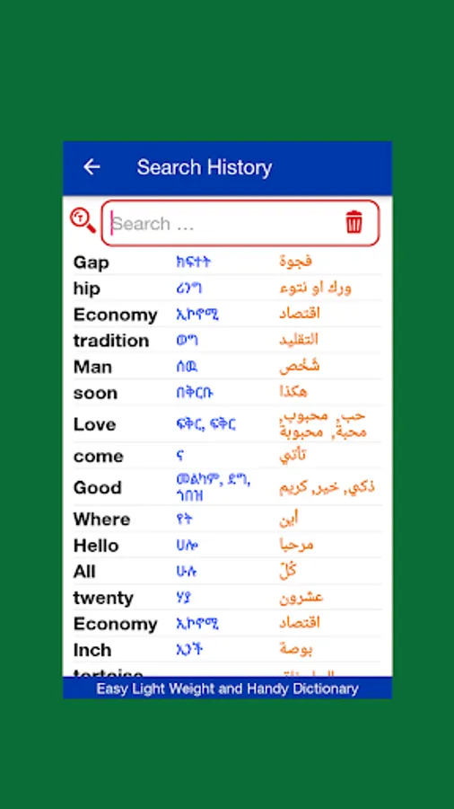 Arabic to Amharic with English offline dictionary. Also show word meaning related example sentence.