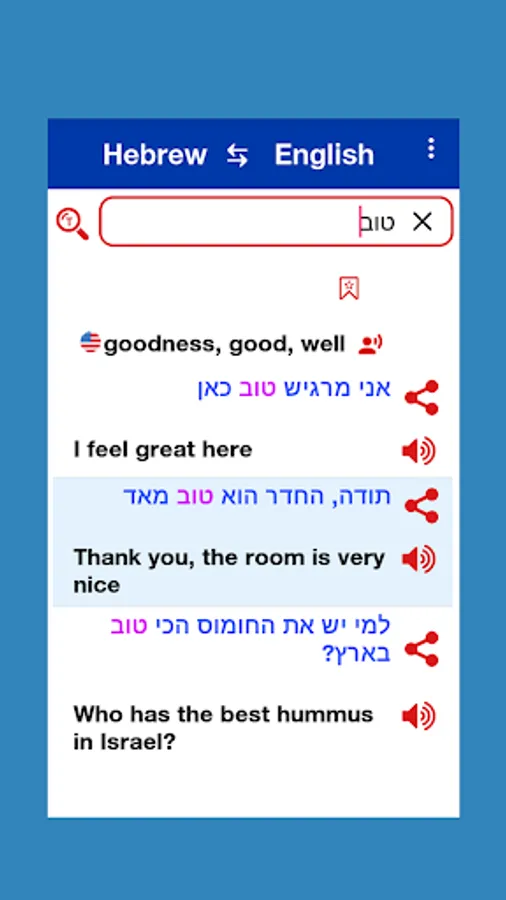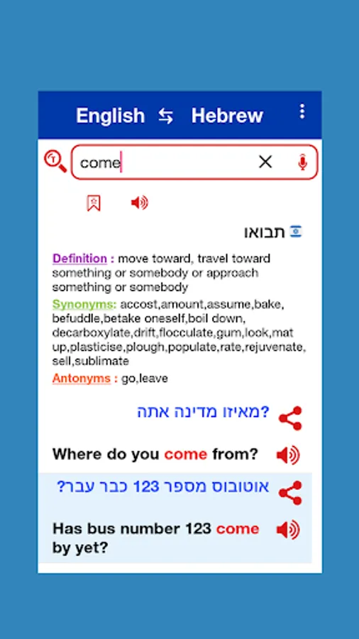 Hebrew to English and English to Hebrew Offline Dictionary. Also show word meaning related example sentence.