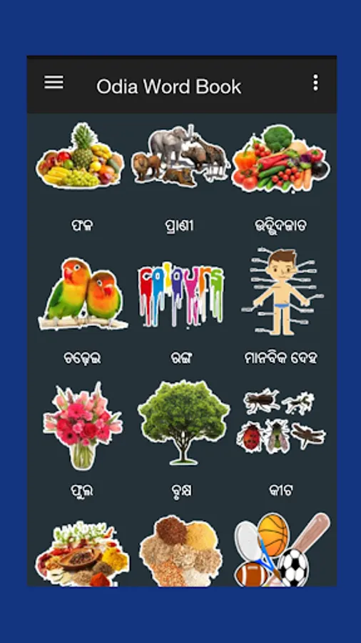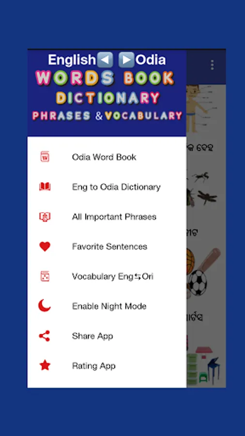 English to Oriya and Oriya to English Word Book with pictures. Also included Odia dictionary, vocabulary and important phrases and sentence.