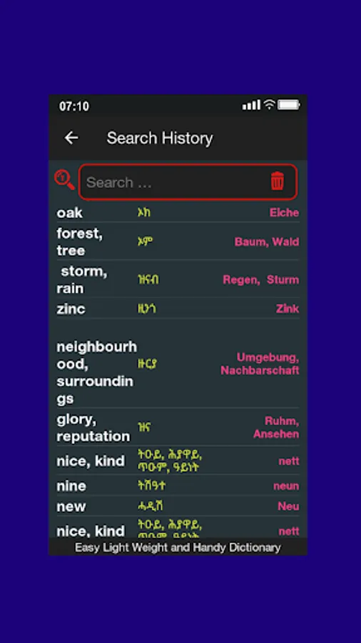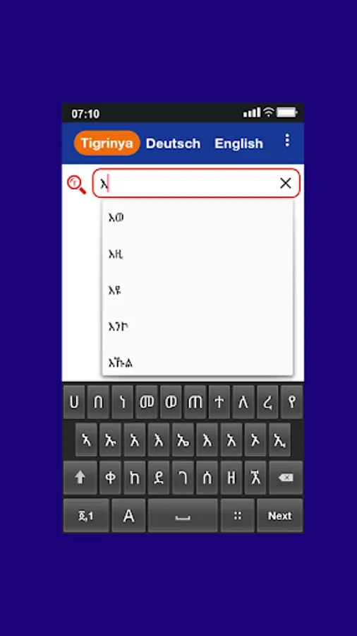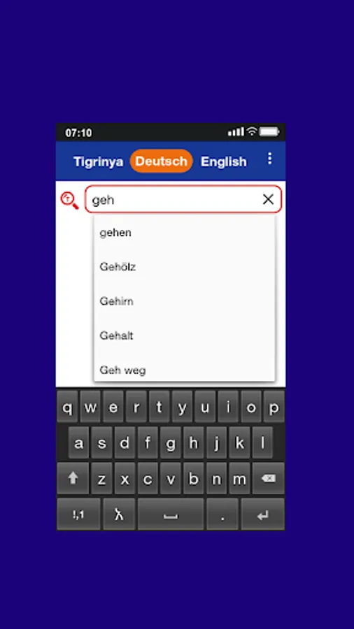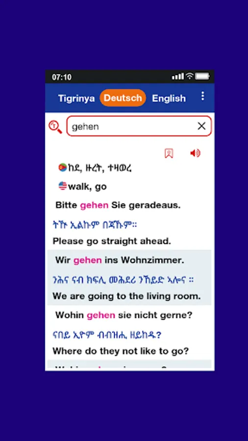 German to Tigrinya and Tigrinya to the German dictionary. Also show word meaning related example sentence.