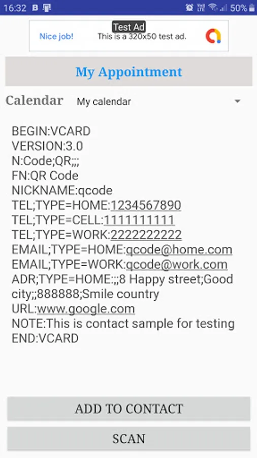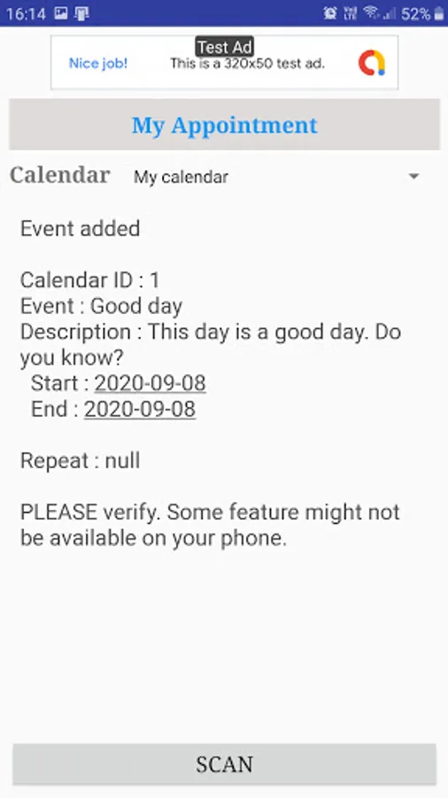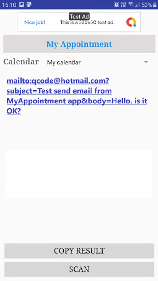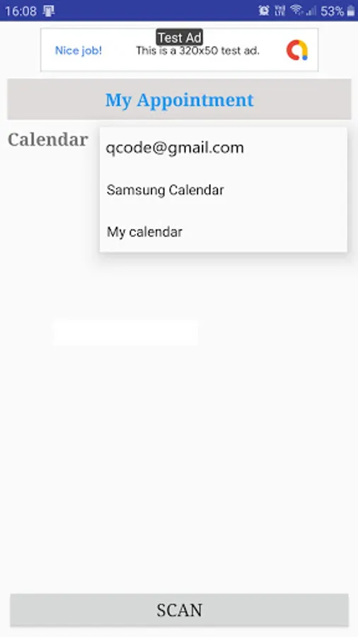 The purpose of this application is to make an appointment by scanning QR code, generated by MyAppointment library. You might have to choose the calendar you want to add first. See the calendar dropdown.