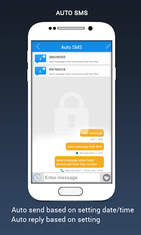 ☆ Auto SMS: Set up content, recepient's number, date, time then message will be sent in right time. There is some options for this, just explore.